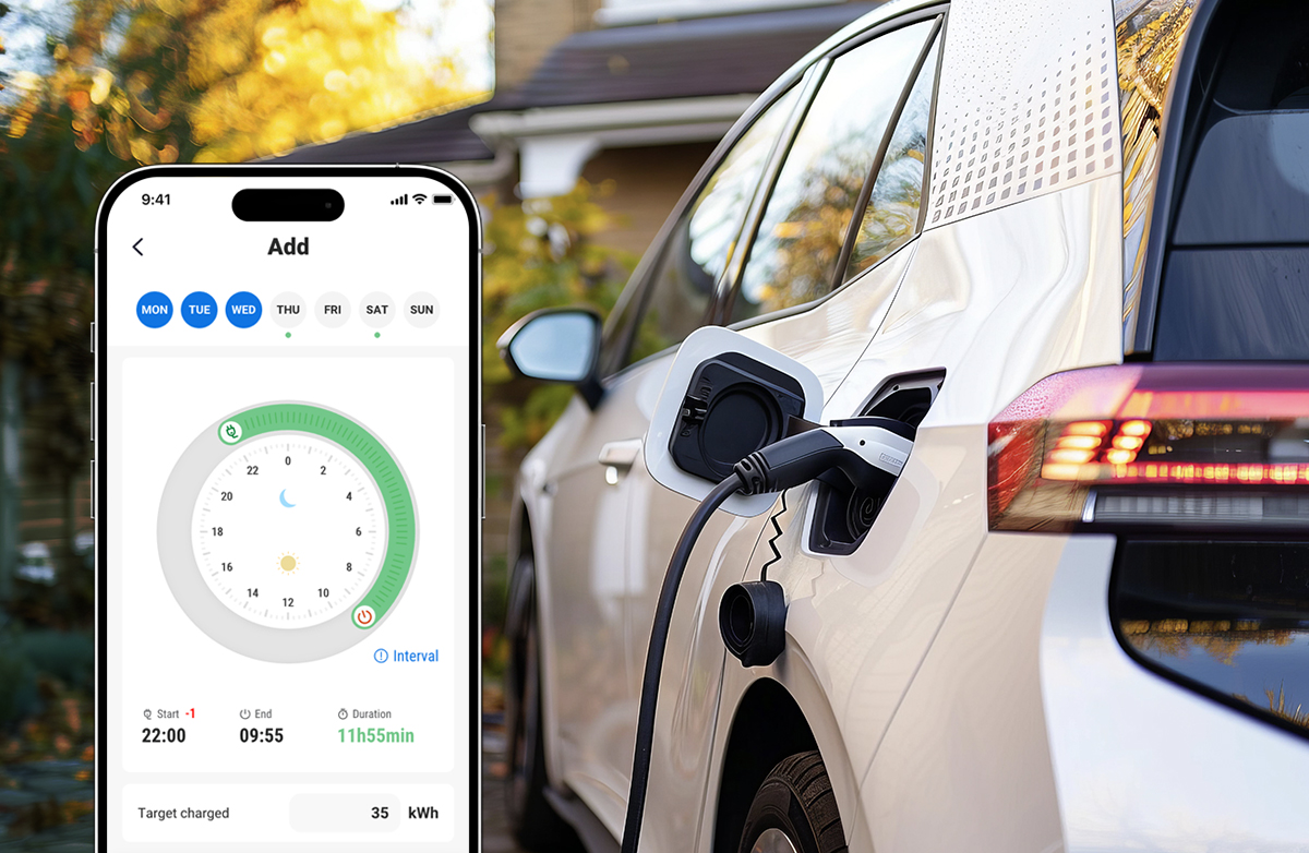 : With enjoyelec App Smart Charging, you can set when your electric car should be fully charged and its target charge. Our system schedules charging to optimize renewable energy use, minimize costs, and ensure your vehicle is ready when you need it.