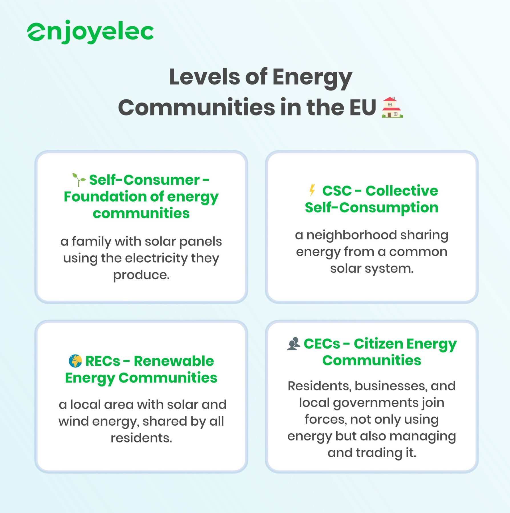 - Renewable Energy Communities (RECs) – Communities focused on producing and using renewable energy sources.