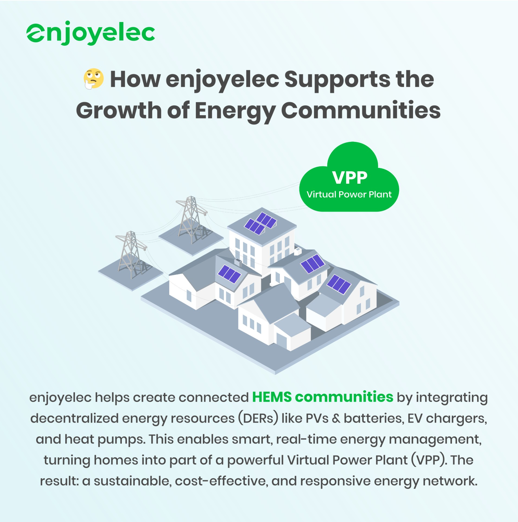 At enjoyelec, we help build connected HEMS communities by integrating decentralized energy systems like solar panels (PV), batteries, EV chargers, and heat pumps. This creates a smart, real-time energy management solution that transforms homes into Virtual Power Plant (VPP). By optimizing energy usage, we contribute to grid stability and help energy communities thrive.