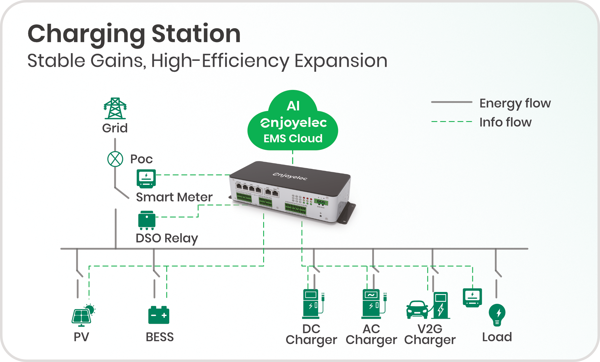 - V2G: The EMS transforms parked EV fleets into dispatchable grid assets. By managing bidirectional power flow, it enables stations to sell stored power back to the grid during peak prices, monetizing idle vehicle time to create a revenue stream independent of charging fees.