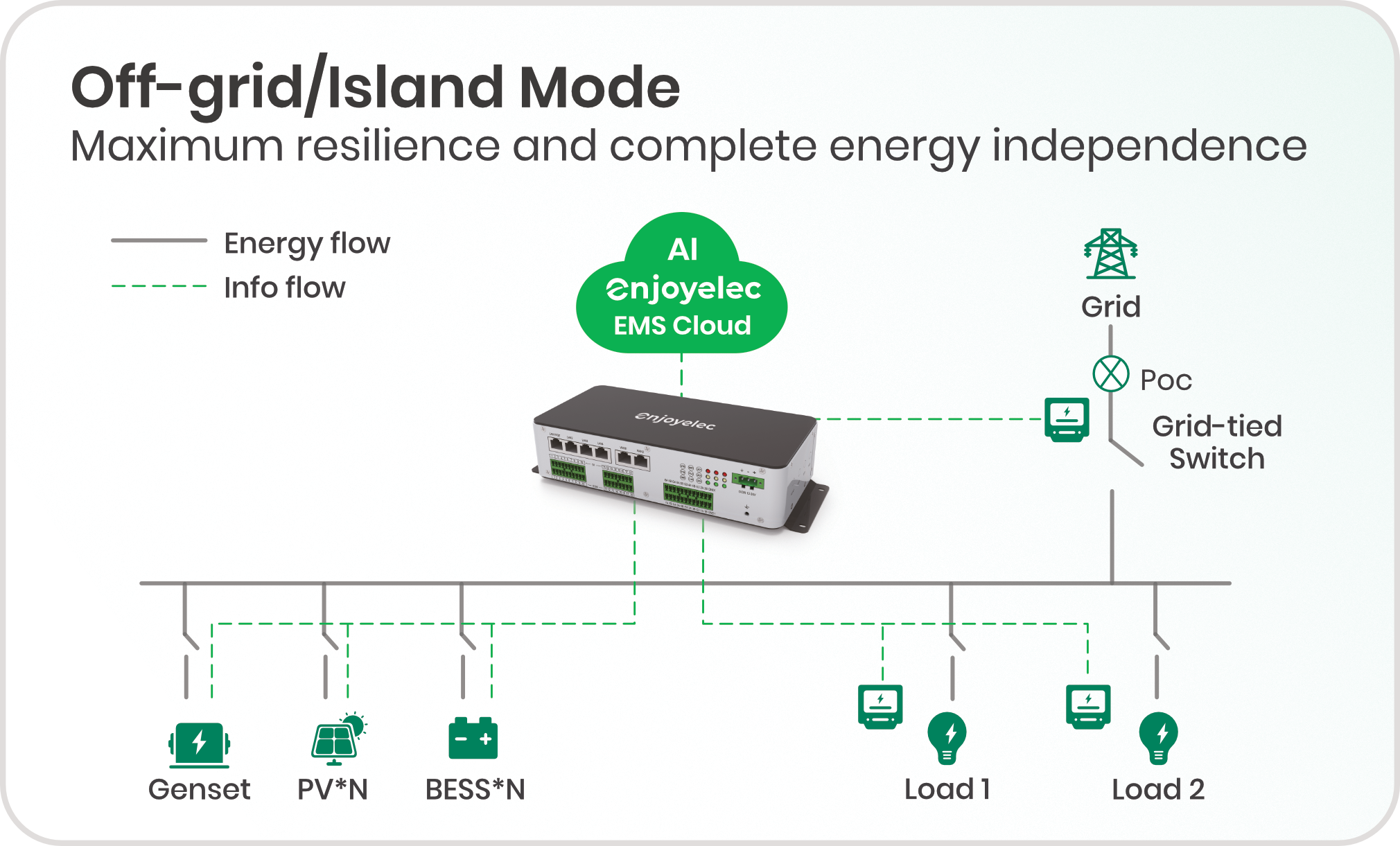 Grid-forming Control: The EMS provides the essential, non-negotiable grid-forming control. This capability enables a mix of solar and batteries to independently establish a stable mini-grid from a black start and maintain perfect voltage and frequency. It lays the foundation for autonomous, utility-grade power for critical off-grid sites like telecom towers or medical clinics, with no reliance on an external grid.