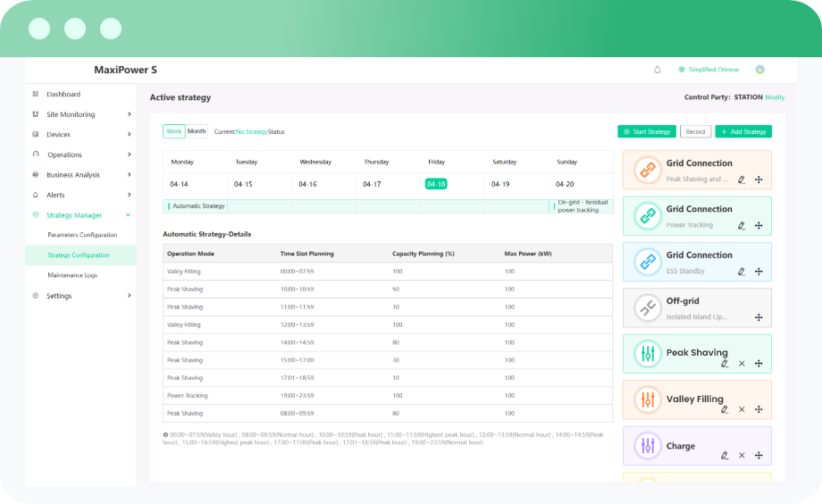 Optimize off-grid operation with multi-zone integration, utilizing solar, storage, charging, and diesel, and configure settings on a daily, weekly, or monthly basis.