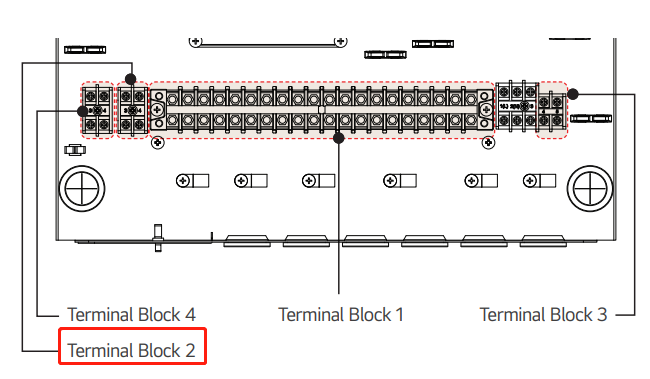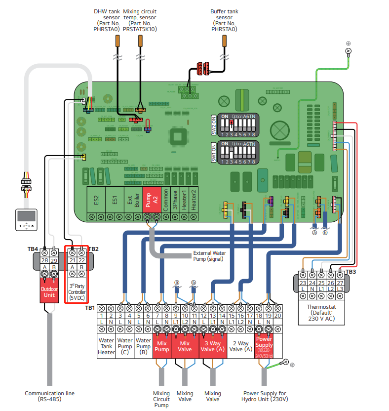 For the THERMA V R290 model, the communication interface is located at the bottom of the unit. By consulting the LG THERMA V R290 heat pump’s User Manual, you can find the communication interface on the terminal block 2 of the indoor unit the terminal 21 marked as “A” is RS485A and terminal 22 marked as “B” is RS485B ,show in the diagram below: