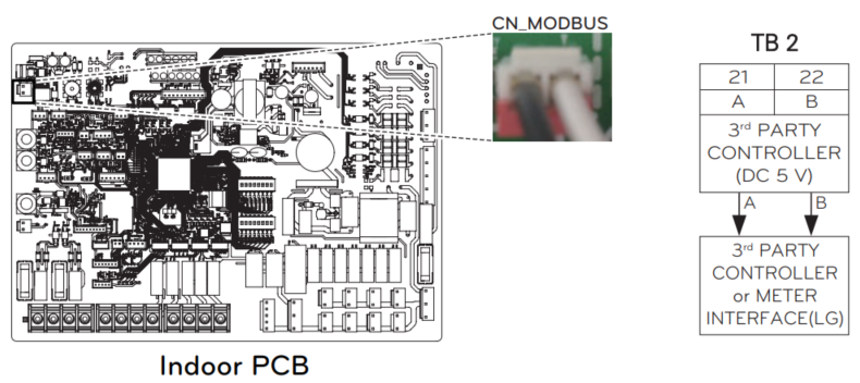 Note: If the CN_MODBUS port is used to interlink with LG metering module, a 3rd-party controller cannot be connected at the same time.