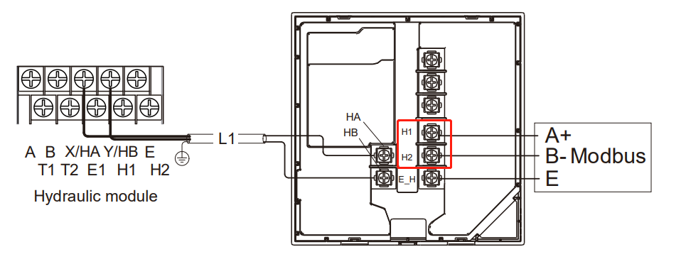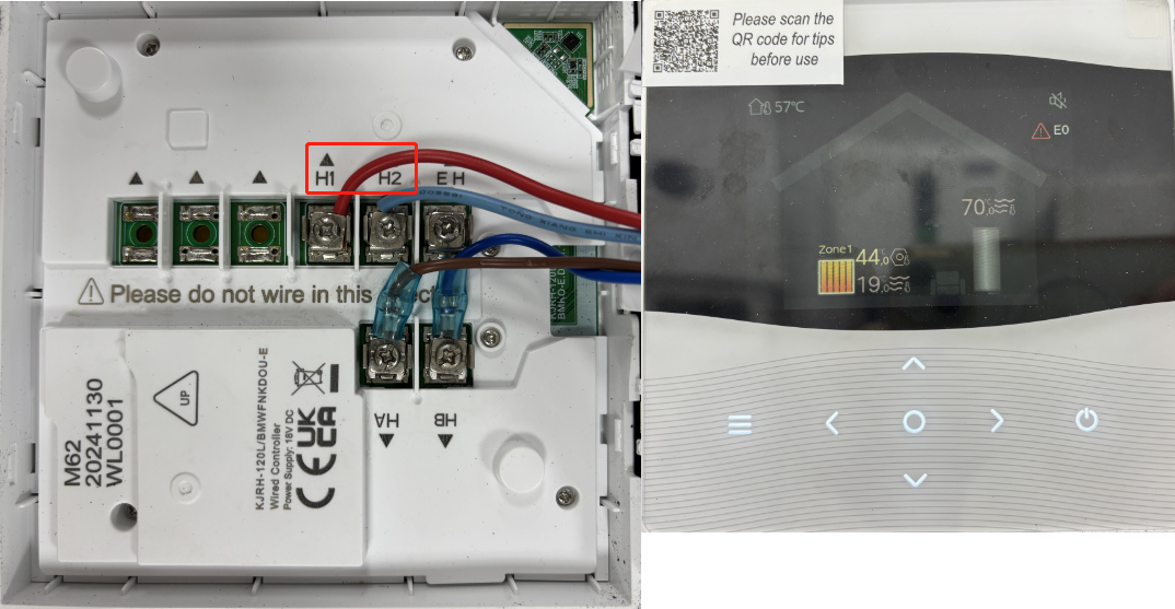 For the Midea R290 model, the communication interface is located on the back of the control panel. By consulting the Midea R290 heat pump’s User Manual, you can find the communication interface on the terminal marked as “H1” is RS485A and terminal marked as “H2” is RS485B ,show in the diagram below: