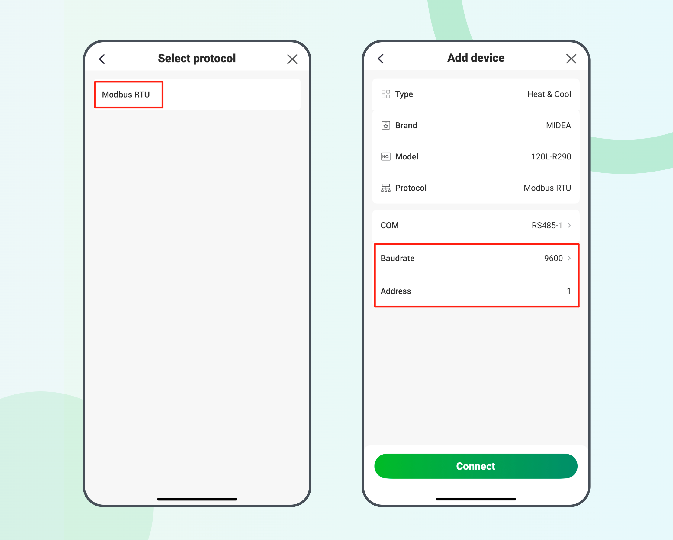 2. Set Protocol: Define the communication protocol, physical port number, and matching parameters (Baud rate/Address).