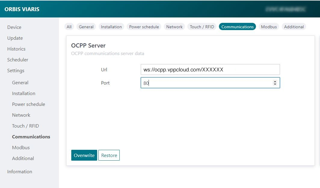 - Set the URL: ws://ocpp.vppcloud.com/XXXXXX where XXXXX is replaced with the Device ID obtained in Step 1 above.