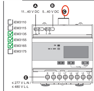 - The communication interface of the Schneider Meter is located at the bottom of the device. By consulting the meter’s User Manual, you can find that the Communication interface (COM) marked as ‘C’ is located as follows: