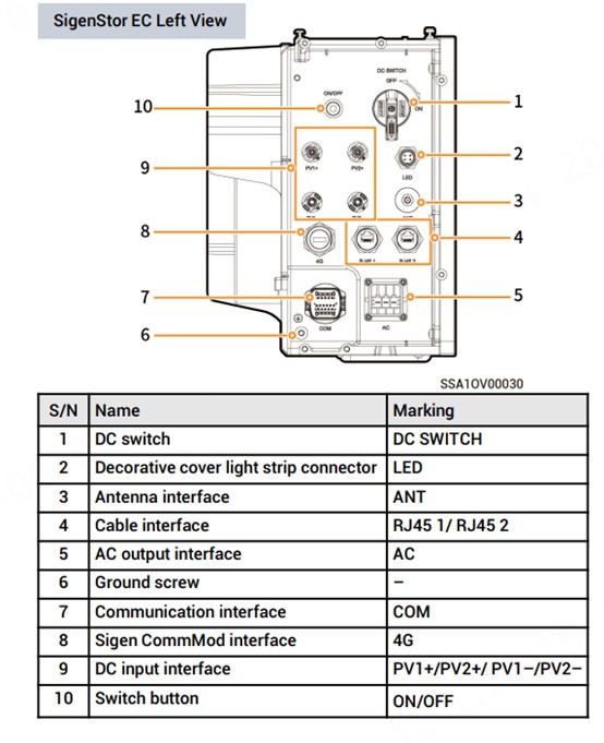 - The communication interface of the Sigenergy Inverter is located at the bottom of the device. By consulting the Inverter’s User Manual, you can find that the Communication interface (COM) is located as follows: