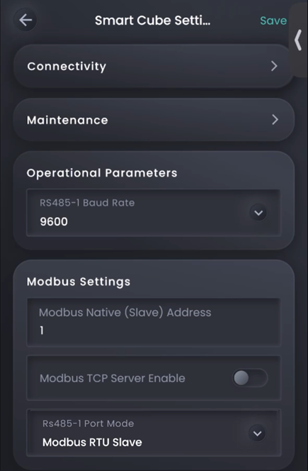 Please Note:If multiple smart cubes are connected in a master-salve mode, please also set the Modbus mode of master smart cube to ‘slave mode’ on the Sigenergy Inverter app as shown in the following figure.