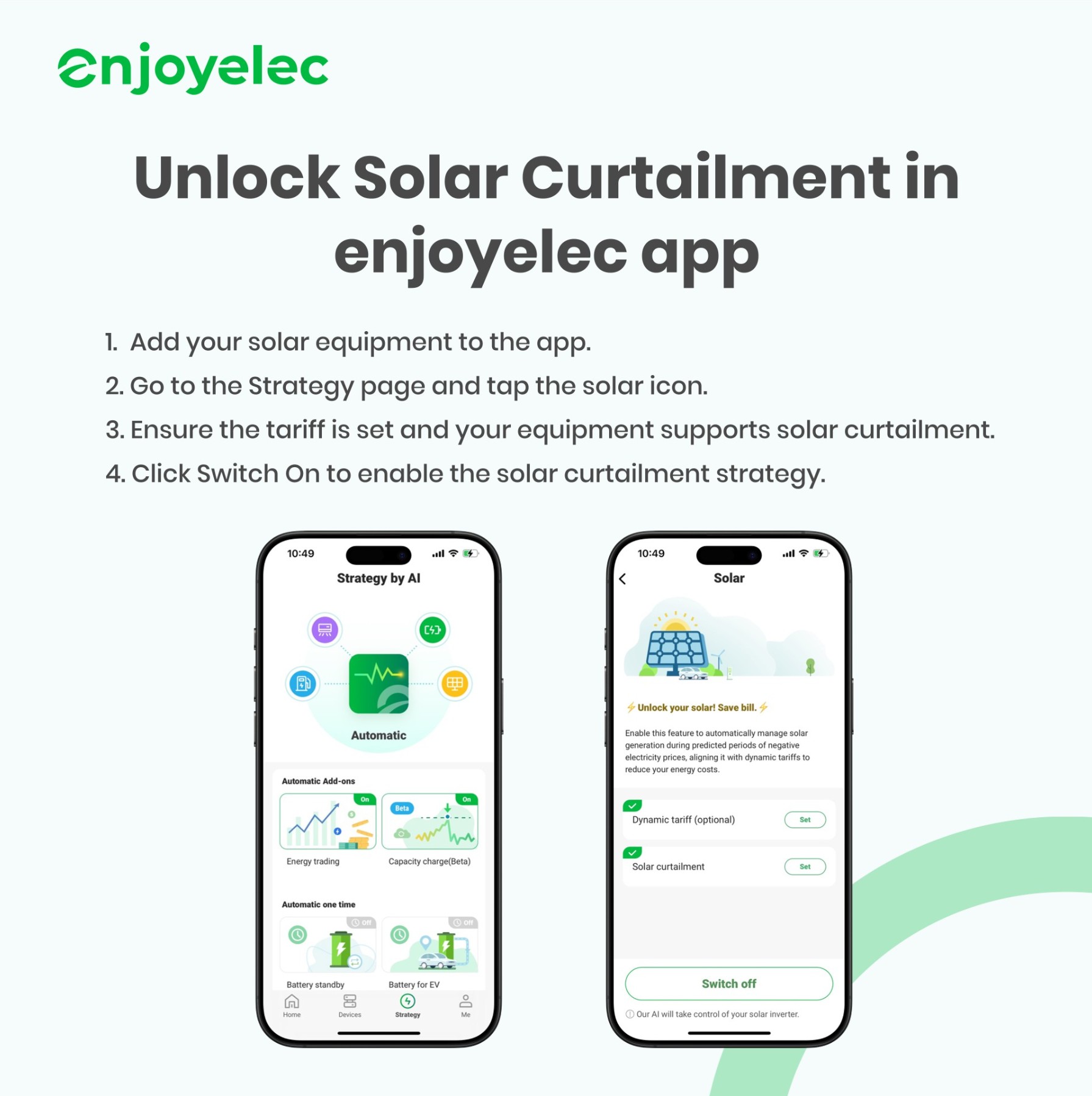 Our HEMS system provides a comprehensive solution to solar curtailment, integrating seamlessly with your energy setup to deliver unmatched efficiency. By maximizing your solar ROI and reducing waste, enjoyelec’s HEMS empowers you to make the most of every ray of sunlight while supporting sustainability goals.