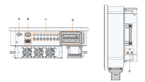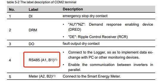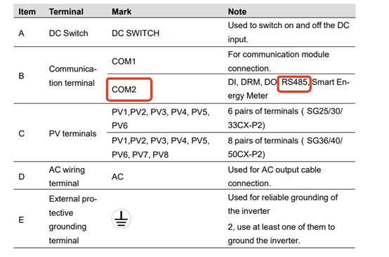 - The communication interface of the Sungrow Inverter is located at the bottom of the device. By consulting the Inverter’s User Manual, you can find that the Communication interface (COM2) is located as follows: