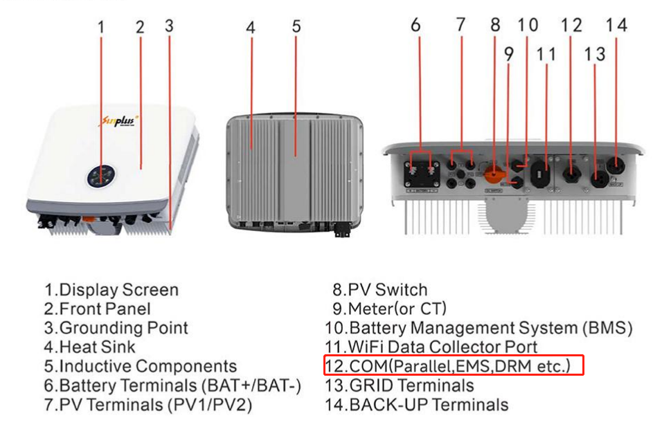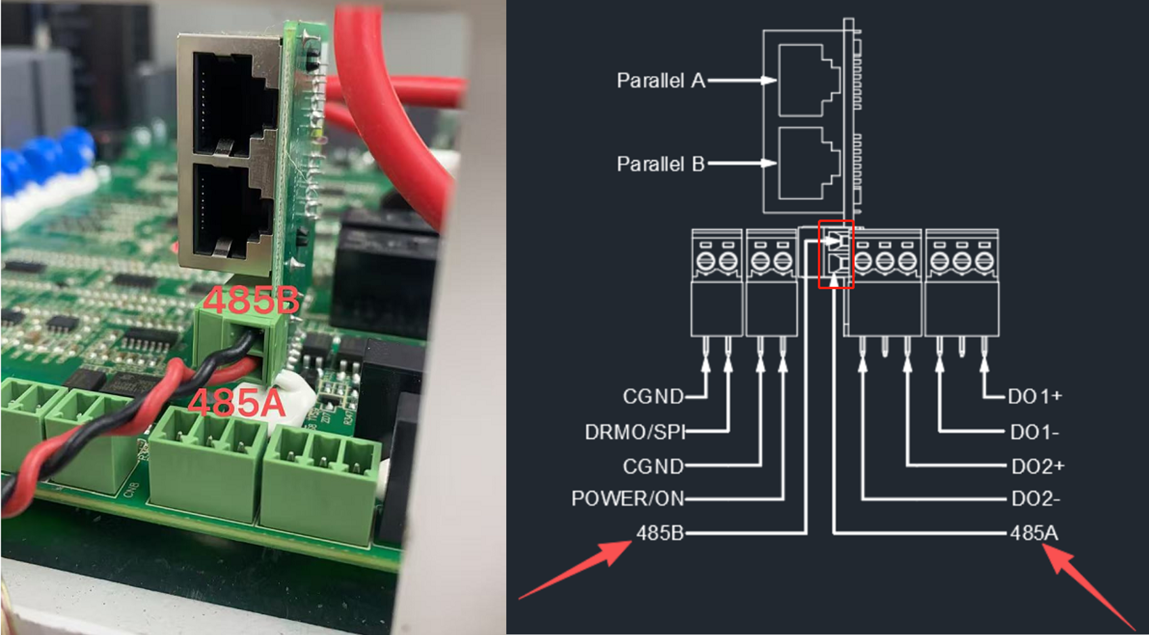 Specifically, the COM port is an 2-pin Terminal marked as “485”. For RS485 communication, the pinout for PIN 1 (485A) and PIN 2 (485B) is shown in the diagram below: