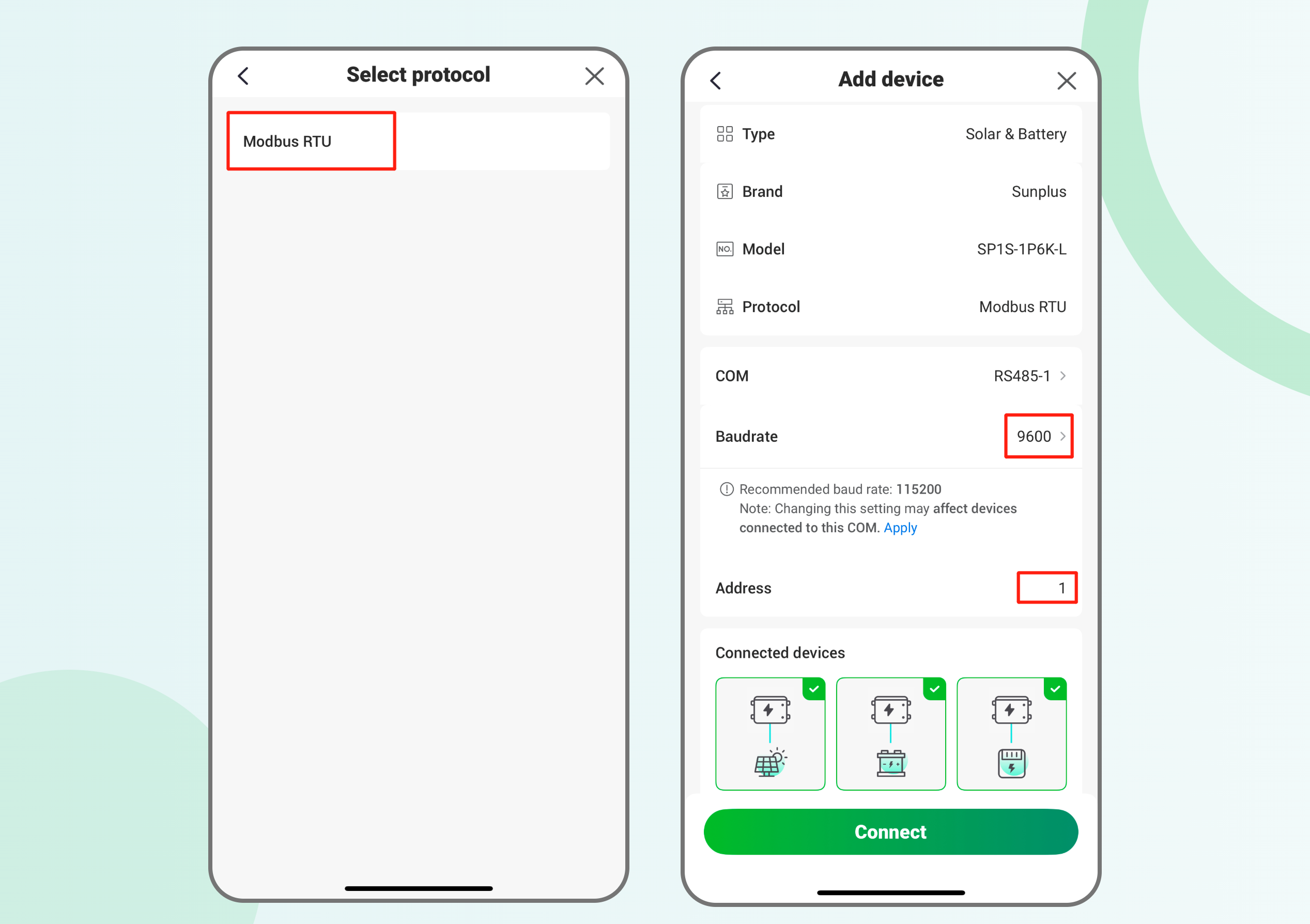 After completing physical wiring, power on both devices. Open the enjoyelec app to bind the device and enter the communication parameters that match your actual setup.